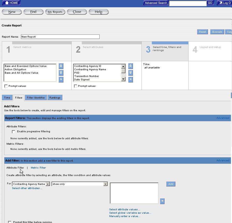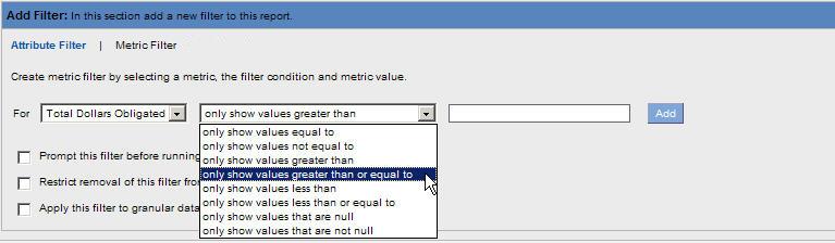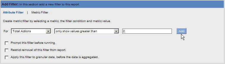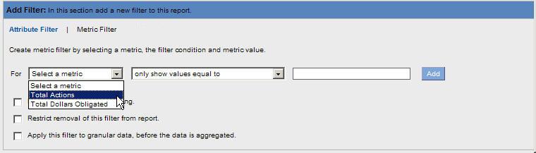 6. The Metric Filter link will display in the Add Filter section. When the Metric Filter link is selected, it displays highlighted in black shown in the following example. This link is used to access filters for each Metric.