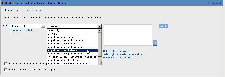 3. After selecting the Attribute Filter, use the drop down menu to highlight and select the operator that provides the range for the Attribute Values.